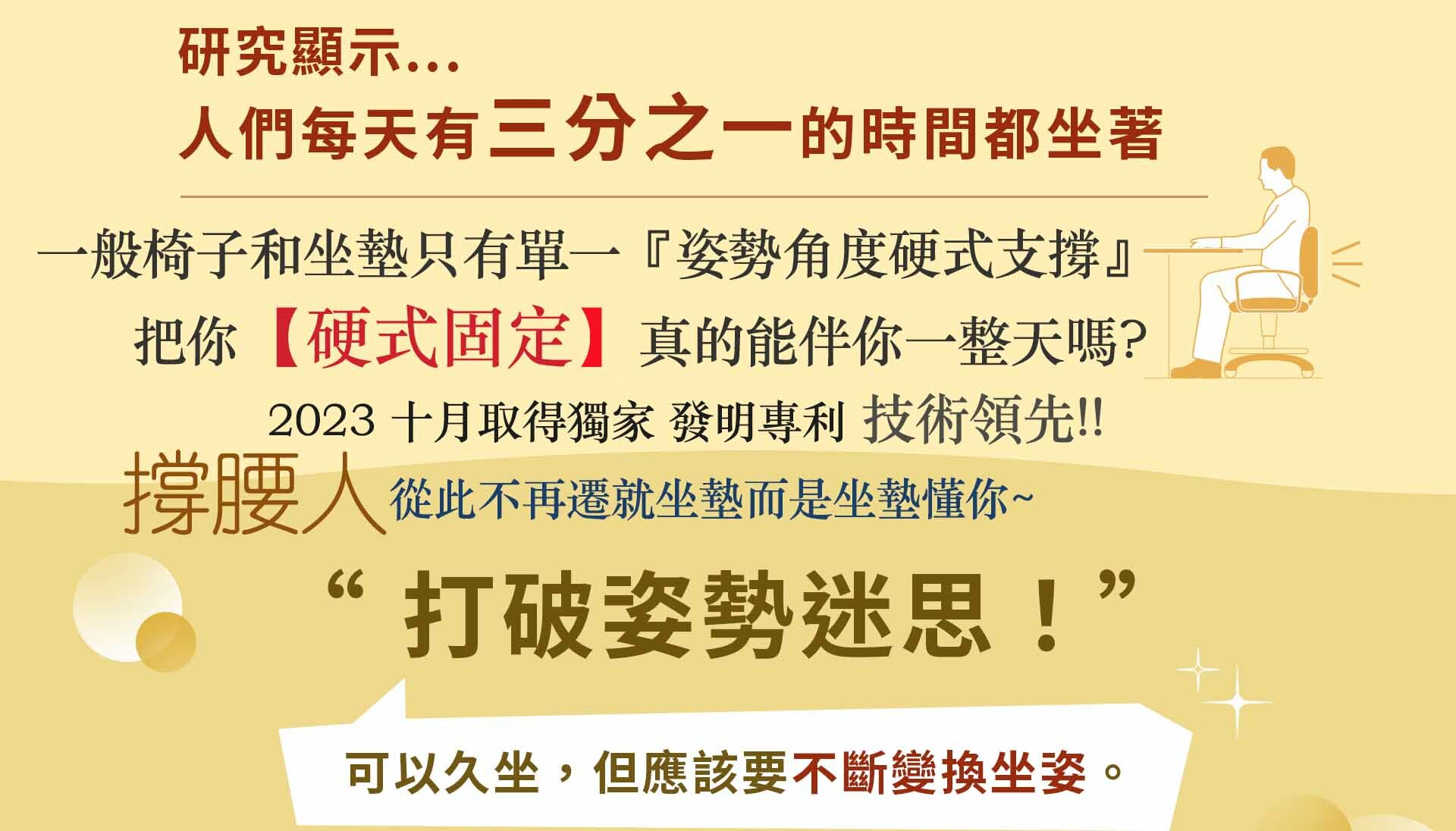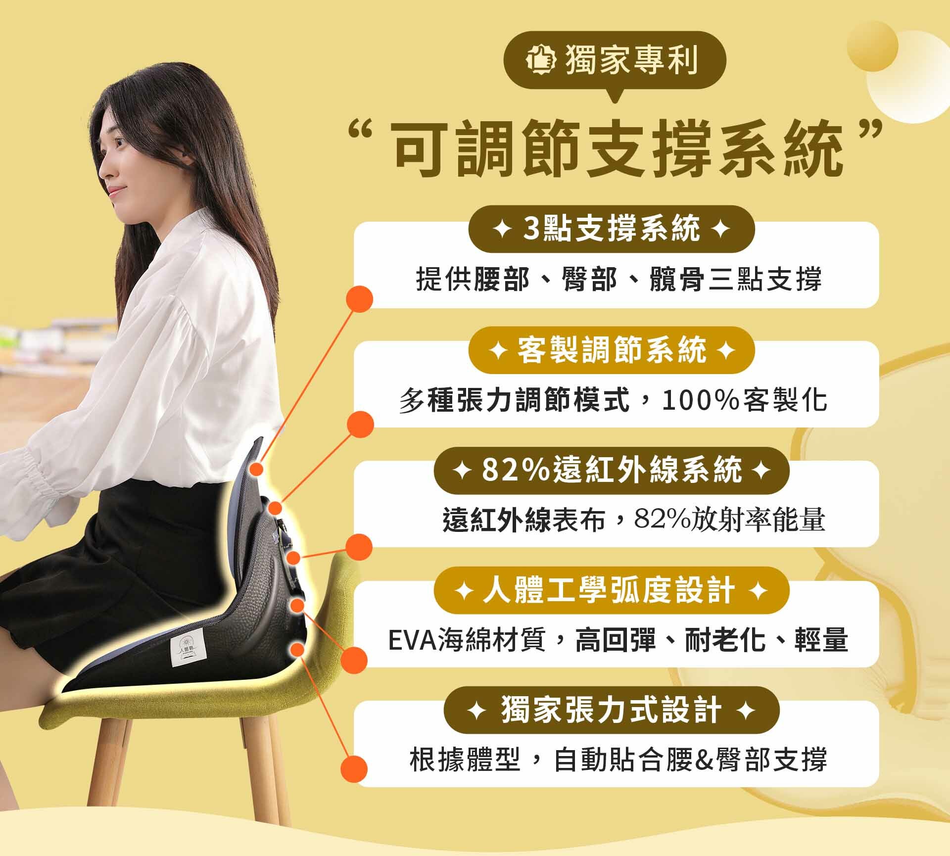 ★工作、學習、辦公、居家、駕車、沙發、床上、不管軟硬、正坐與斜躺的椅子、不同使用環境下,皆會自動或可自行調整腰部與臀部支撐度,撐腰人永遠為您撐腰護臀幫助舒適久坐